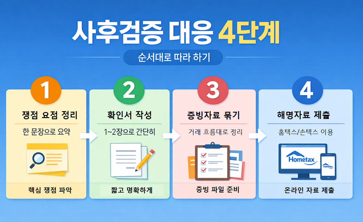 부가세 확정신고 후 사후검증 안내를 받으면 당황할 수 있지만, 대부분은 아래 순서로 대응이 됩니다.