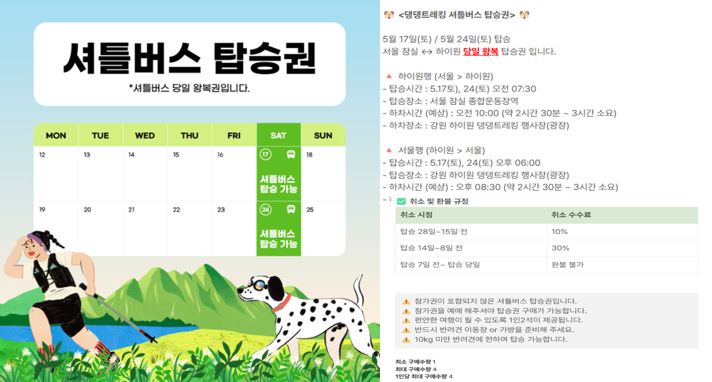 댕댕트레킹은 반려견과 트레킹 장소로 이동할 수 있는 셔틀버스를 제공합니다. 아래 정보를 확인하시고, 필요하신 분은