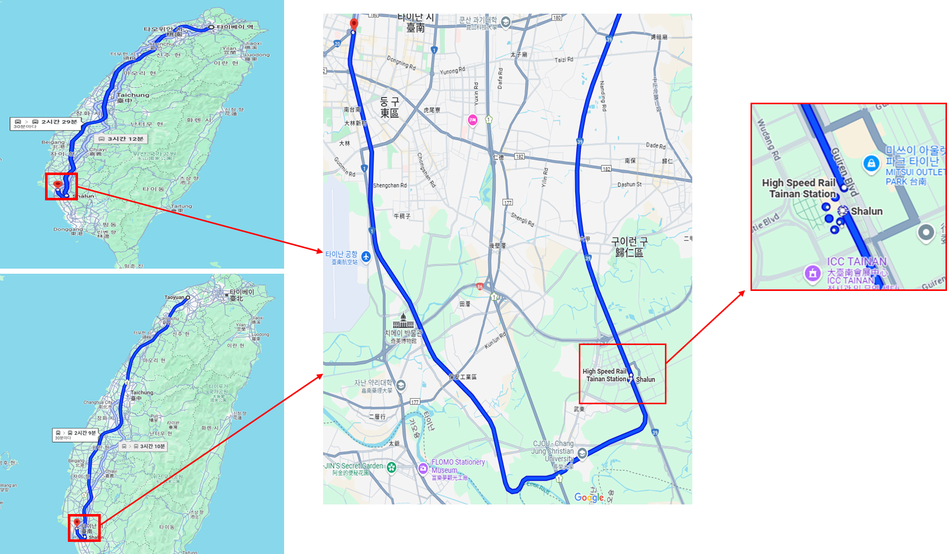 • 하단에 보이는 High speed Rail Tainan Station(타이난 고속철도역)에 도착하여 하차 후