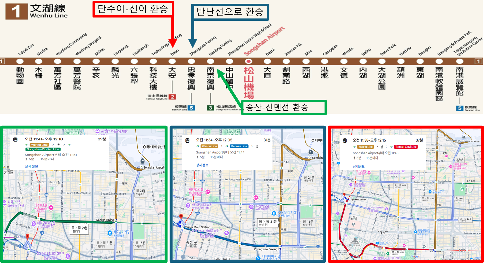 쑹산 공항역에서 B4층에서 열차에 탑승하여 각 호선에 따라 환승 후, 타이페이 메인 스테이션역으로 이동하면 됩니다.